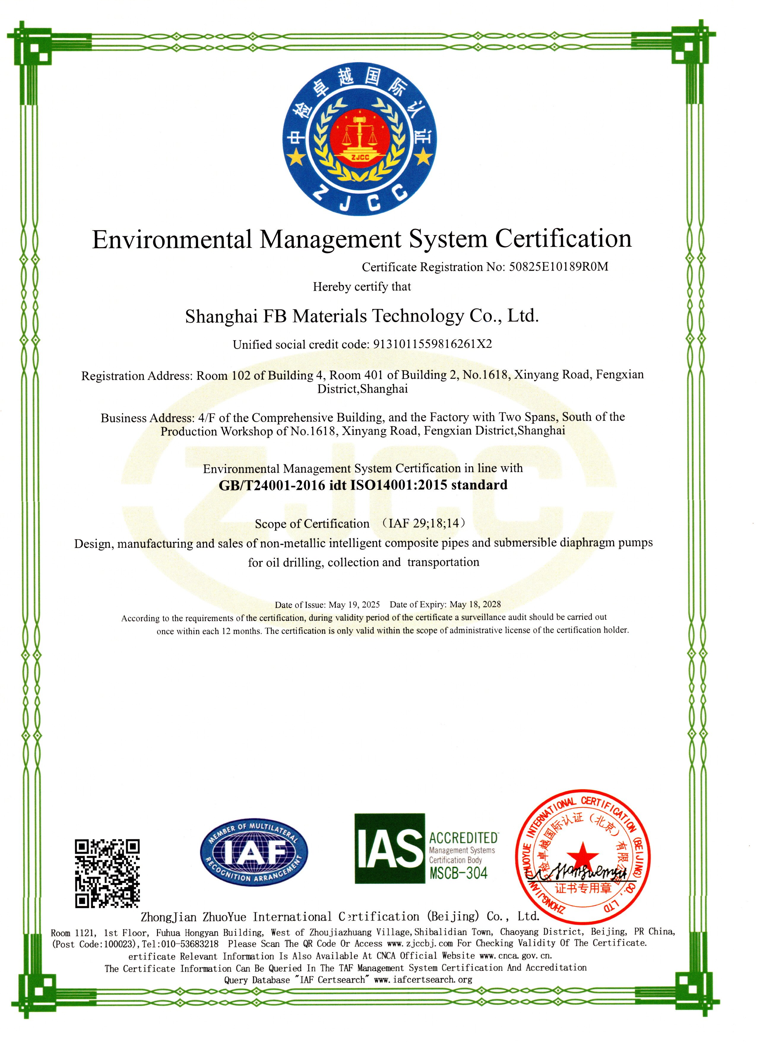 ISO 14001:2015环境管理体系认证,证明公司对环境保护的承诺和责任。
